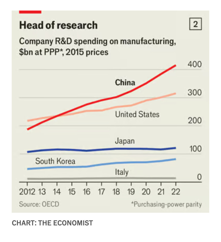 Meanwhile, corporate China has, since 2014/5 built a large lead in corporate R&D spending.