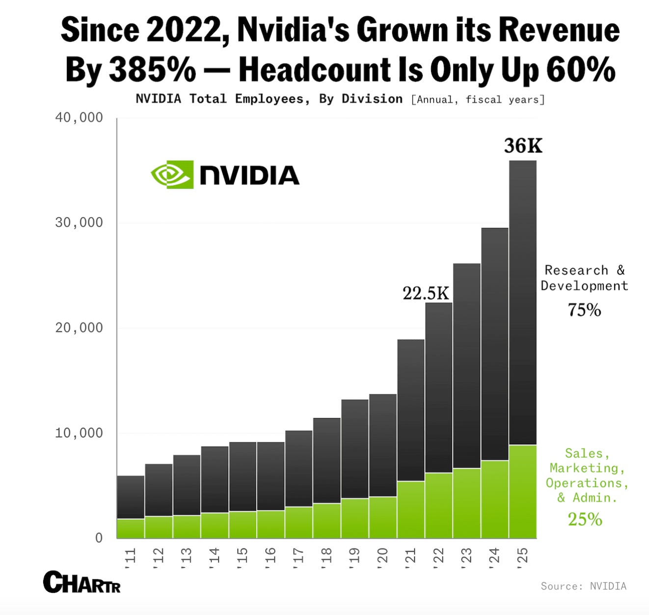 Considering Nvidia more than doubled its revenue in 2024, from ~$61 billion to an eye-watering ~$130 billion, the fact that the responsibilities of its HR department have grown only 20% is nothing short of remarkable.
