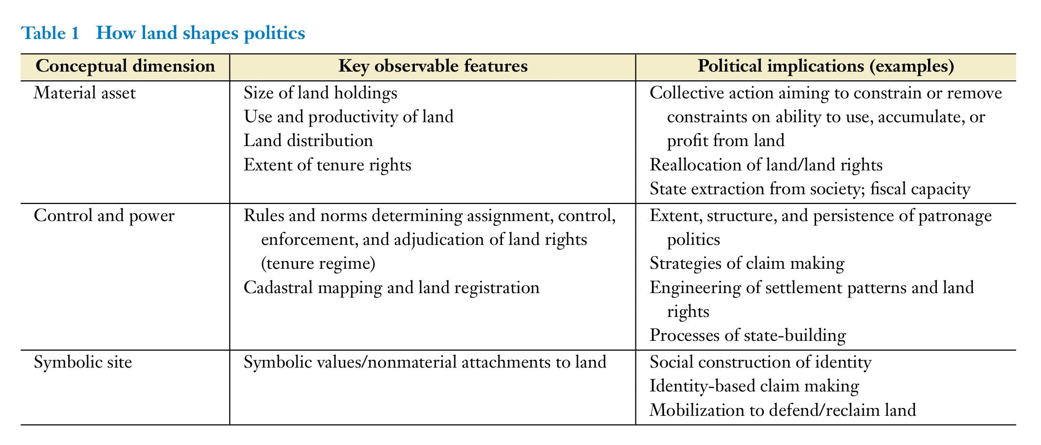 Human societies and their politics are deeply rooted in the land. Land shapes politics through its material nature and distribution across society, by serving as a mechanism of control and state-building, and by acting as a symbolic site that imbues identity and belonging. That land is inextricably intertwined with politics makes it a crucial driver of a wide range of social, political, and economic outcomes. We explain and survey these rich and complex relationships, focusing on the formation of political preferences and identities, the forms and dynamics of political violence, and the long-term structure of society, ranging from patterns of settlement and dispossession to inequality, state capacity, and economic development and urbanization. Land access, land rights, and land tenure institutions are all implicated in these outcomes. We conclude with reflections on promising research frontiers in the study of land and politics, including climate change, migration, and urbanization.