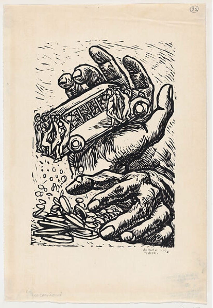 Alfredo Zalce, 'Los Camiones', a giant pair of hands about to crush a bus full of people, 1946.