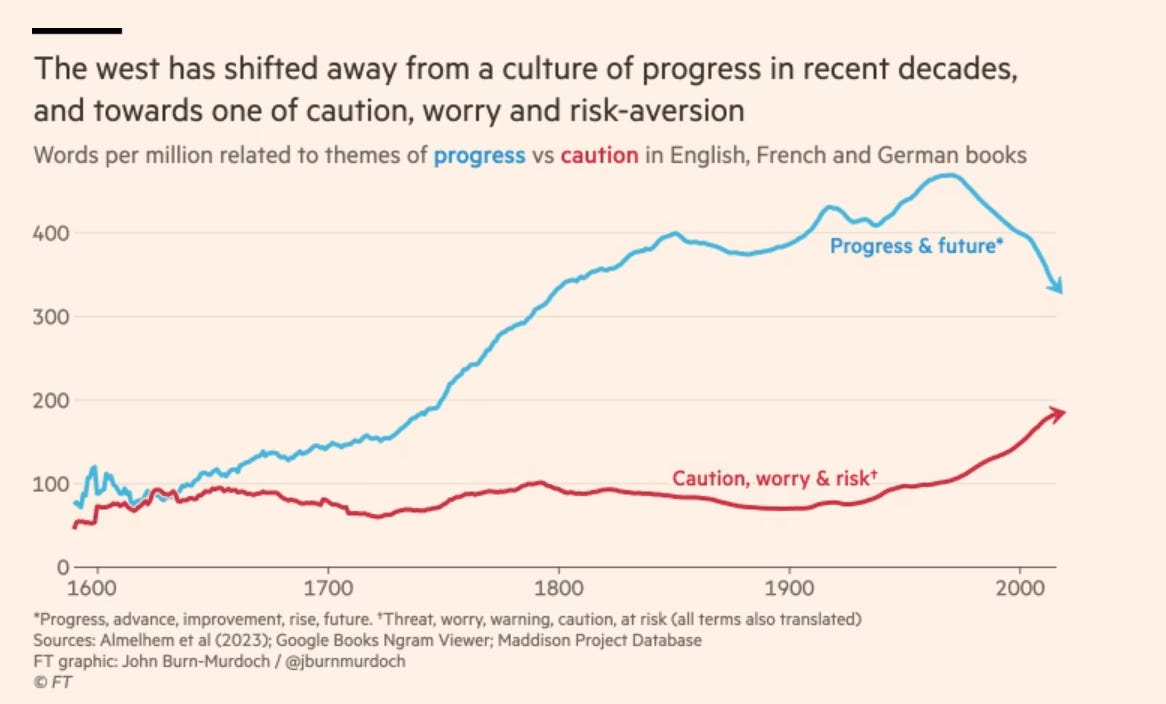 The claim is a heavily ideological one. It takes discourse and the cultural environment to be determinative even though the evidence presented supports no such proposition; why is it not likelier that a set of social changes in early modernity, not least the growth of urban trade, settler colonial expansion and merchant capitalism generated massive discursive change and then industrial transformation? The important thing is how this historical argument sustains a claim about the present and the future. Techno-optimists and (to my surprise) Burn-Murdoch worry that the West is not talking brightly enough about the future: