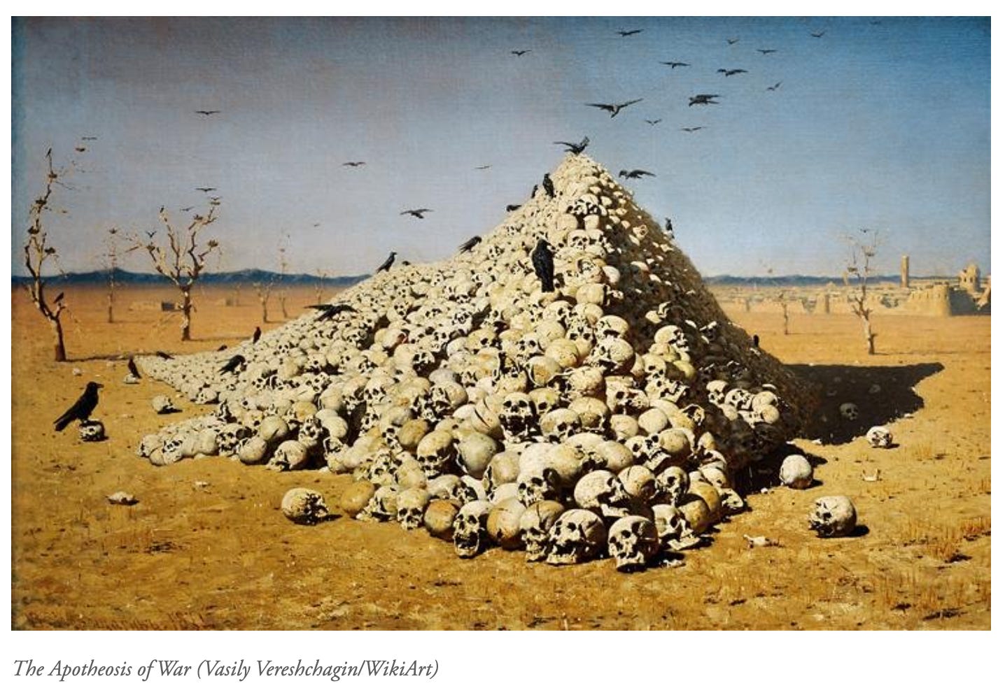 The Apotheosis of War, the famous painting of piled skulls on a barren field and notorious confuser of German generals, was painted in the aftermath of the 1868 siege of Samarkand, one of countless bloody battles during the two-year long Russian campaign to occupy the region of Bukhara in Central Asia. Based on accounts of an ancient Mongol army piling the skulls of its vanquished enemies outside of conquered cities as a warning against resistance to Mongol occupation, history repeated with the equally violent Russian occupation. Tongue-in-cheek, Vereshchagin dedicated his painting "to all great conquerors, past, present and to come.” Today, the Tretyakov Gallery in Moscow displays Apotheosis,