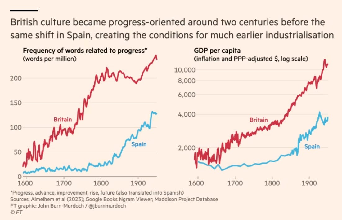 A certain kind of old-fashioned idealism, the claim that ideas drive material historical developments, dies hard. In moments of material decline, it is common for the worried to thrash around for explanations and blame culture or prevalent ideas for degenerating. Now we have a fine model of that in the FT, where John Burn-Murdoch asks how progress talk in the Anglospheres v. Hispanic world correlated with relative economic growth since 1600 — claiming to find an explosion of optimism in pre-industrial Britain and so reaching for the conclusion that such talk played some role in causing massive technological transformation. Burn-Murdoch is drawing on new research from Almelhem et al, available in full here. Here is the image that sums it up: