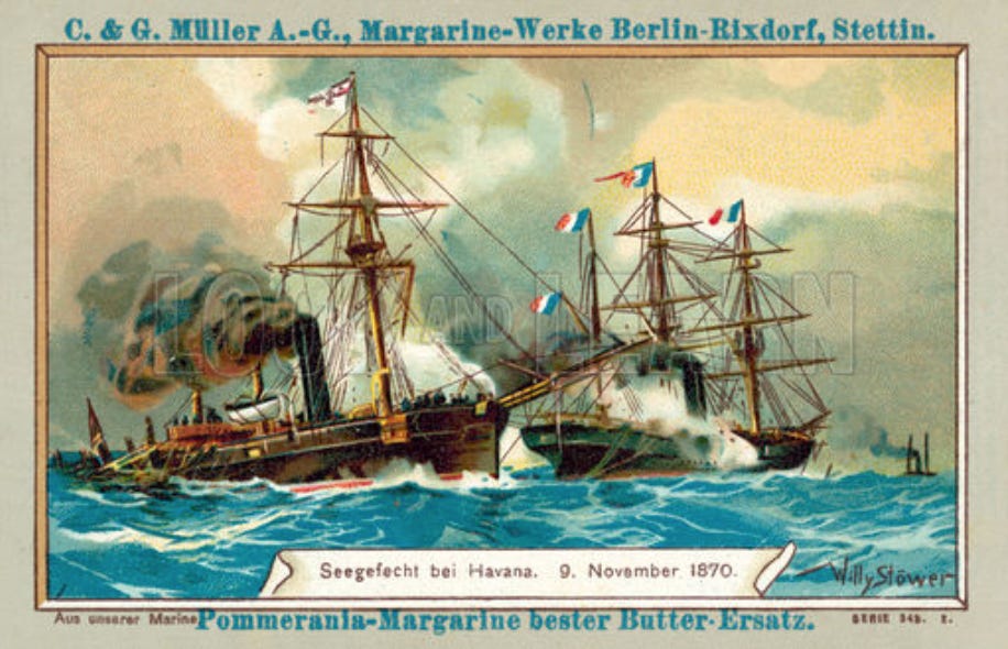 The Battle of Havana, November 9th 1870. A card issued by a margarine manufacturer – SMS Meteor on left