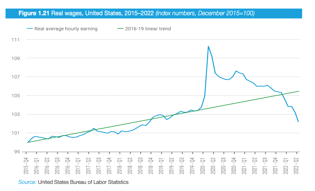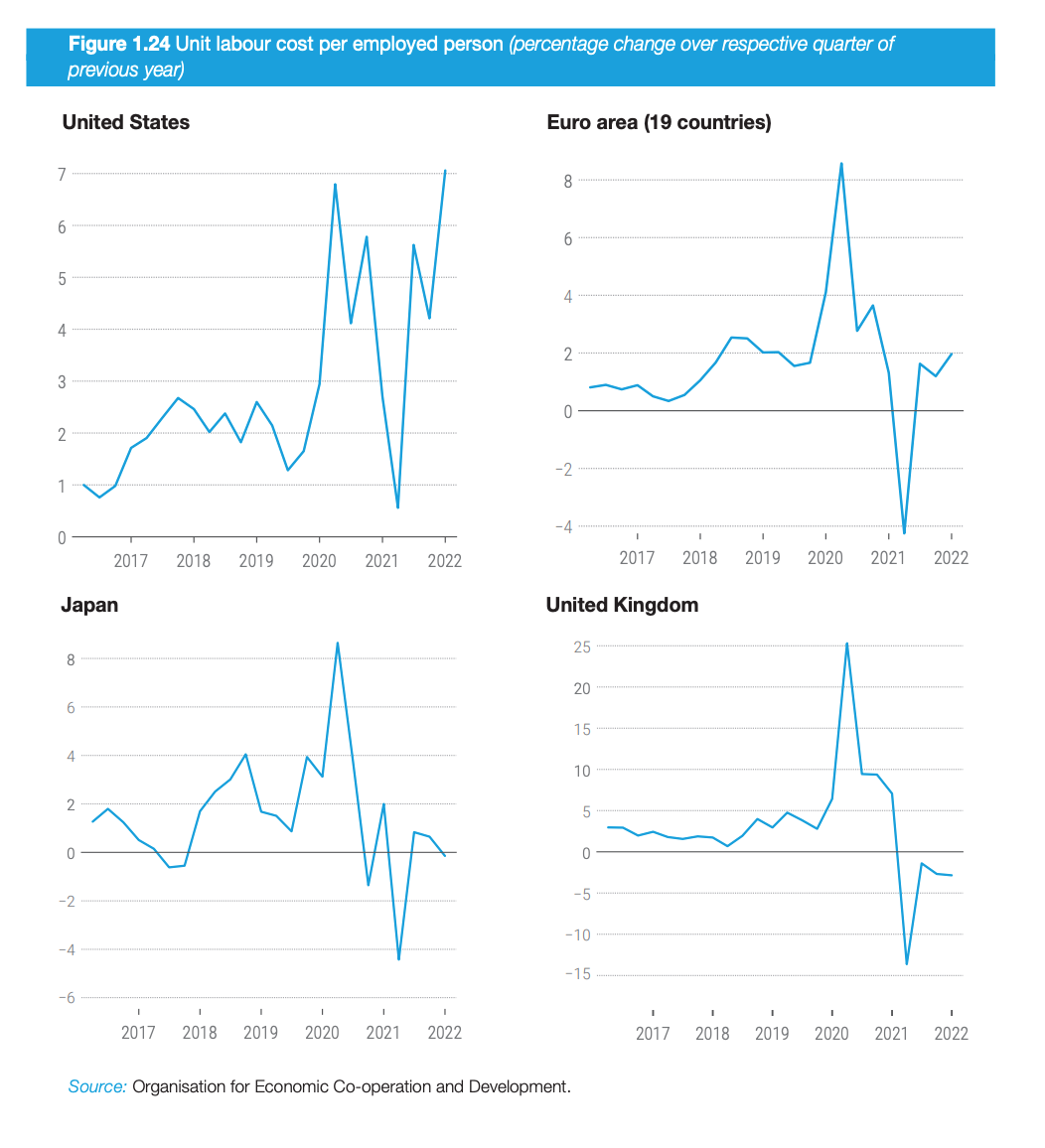 In the United States, nominal wage growth outpaced labour productivity, pushing the ULC substantially up in late 2021 and early 2022 even as real wages declined. In the first quarter of 2022, the ULC was up 7.1 per cent. In contrast, in the European Union, at the beginning of 2022, annual growth rate of ULC was 2 per cent, in line with the region’s long-term inflation target. In Japan, the ULC was practically stable in the beginning of 2020 (zero growth rate), also ruling out excessive demand pressures in the labour market. The most remarkable case is the United Kingdom, where the ULC growth rate shot up to double digits during the lockdown of 2020 and then collapsed to negative double digits during reopening. The United Kingdom ULC continued to fall in first half of 2022, with nominal wage growth almost 3 points below labour-productivity growth on an annual basis.