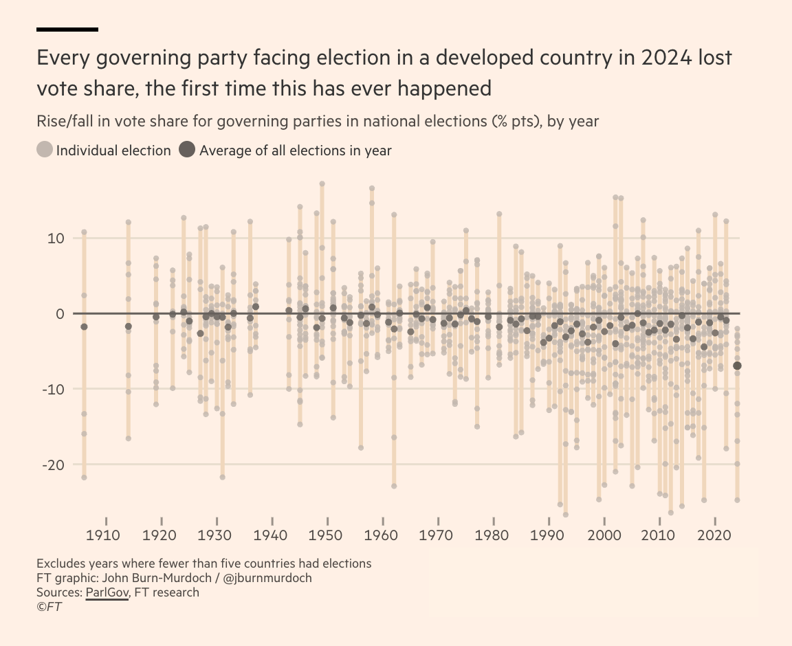 The electoral damage done to incumbents across the developed world in 2024 was utterly unprecedented.