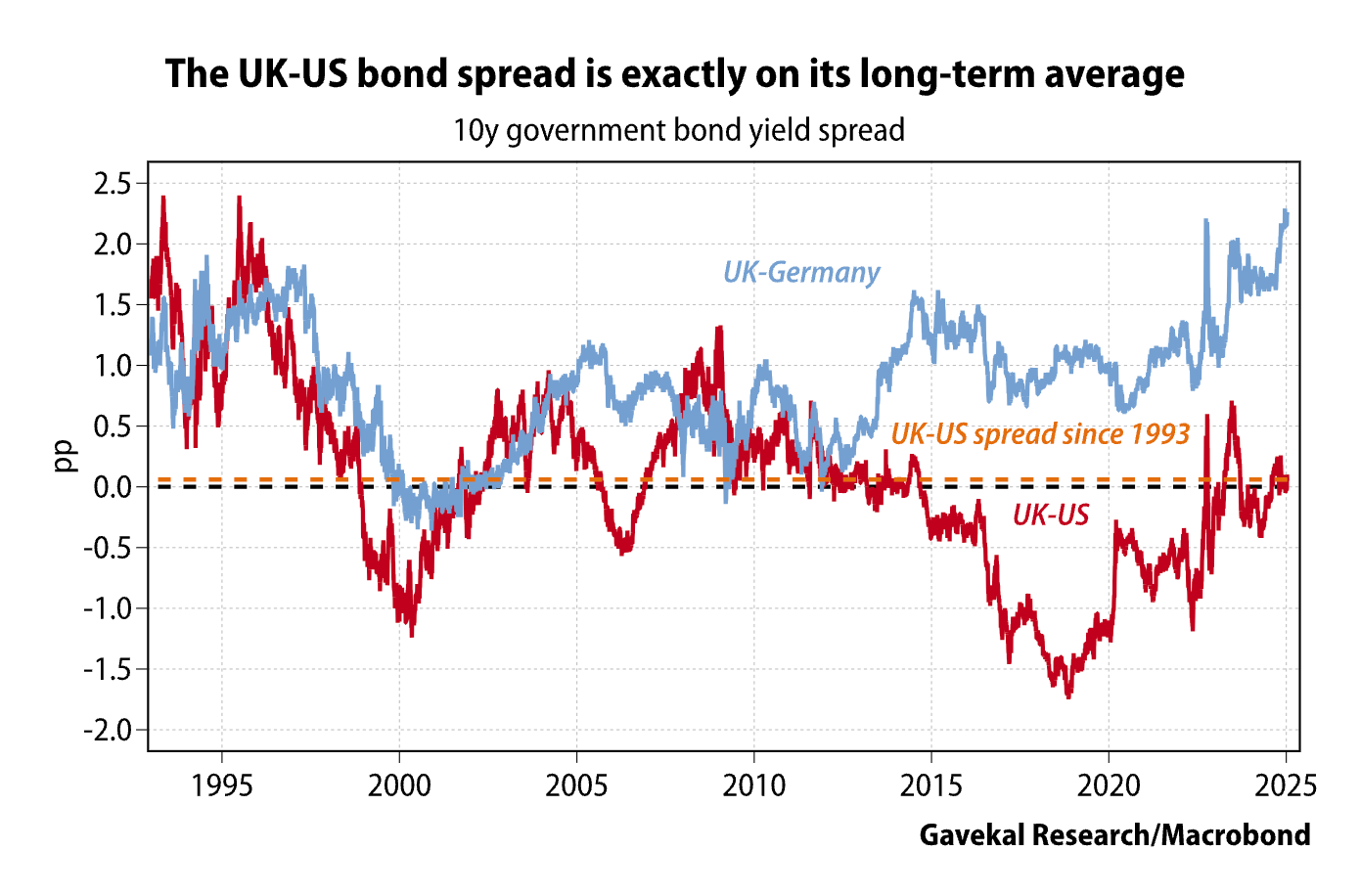 In fact, as the chart on the prior page shows, today’s spread between US and UK bond yields is far below where it was in the 2022 Truss fiasco and has settled at exactly its long-term average, after narrowing in the past two months. This suggests that the much wider spread between gilt and bund yields is mainly a function of Germany’s economic weakness, not of conditions in Britain.