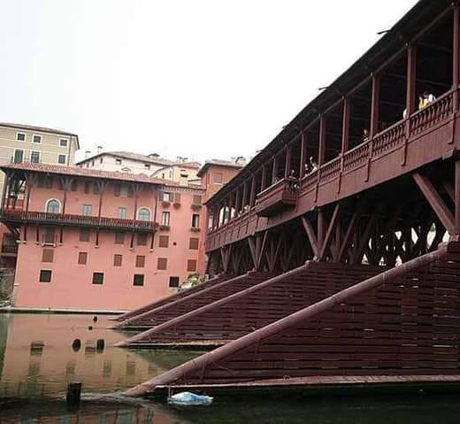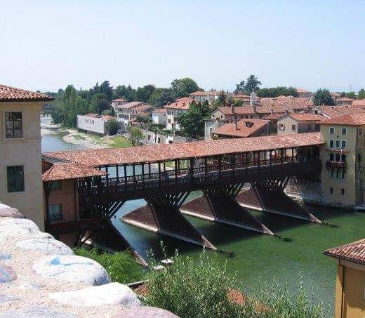 The Ponte degli Alpini spans the River Brenta and is also known by other names, such as Ponte Vecchio or Ponte de Bassano, as it is in the town of Bassano del Grappa, in the province of Vicenza in Veneto. It is considered one of the most characteristic bridges in Italy. A pre-existing bridge, made of wood and covered with a roof, connected Bassano and Vicenza between the 13th and 16th centuries. At the beginning of the 14th century, Bassano was involved in the War of Padua and two towers were built to protect the bridge. A century later, as a result of another war, another bridge was built, but it was destroyed during a flood. In the 16th century, French troops set fire to the bridge to prevent the army from escaping (during yet another war, obviously). The original bridge dates from 1209 and was designed by Gerardo Maurisio, however, the way we know it today is a project by none other than Andrea Palladio. In October 1567, the Brenta River suffered a violent flood that overtook the pre-existing bridge. Palladio was soon involved in the reconstruction. Initially, he designed a stone bridge, totally different from the original, in three arcades like the ancient Roman models. The city council turned down the project because they did not want it to depart from the traditional wooden structure.