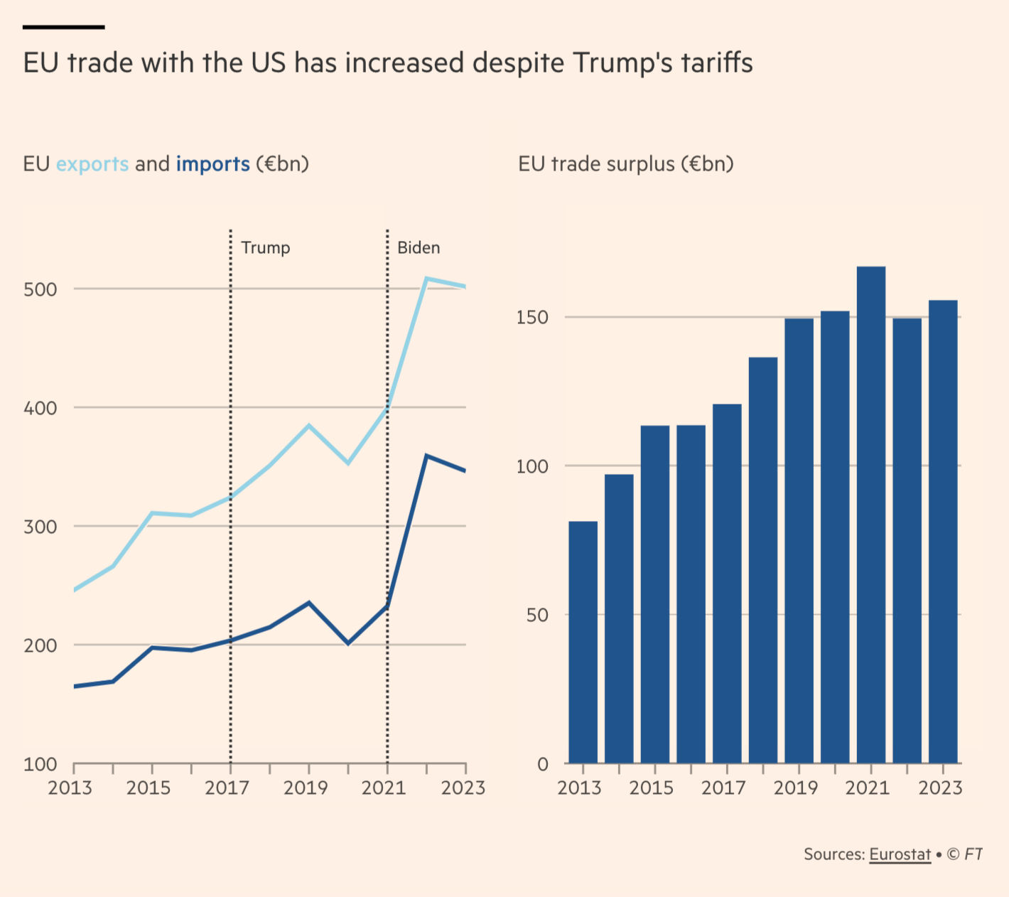 Brussels is developing a two-step trade strategy to deal with Donald Trump, offering the Republican a quick deal if he wins a second term as president, and targeted retaliation if he opts for punitive tariffs instead. EU officials see the carrot-and-stick approach as the best response to Trump’s pledge to impose a 10 per cent minimum tariff, which they estimate could reduce EU exports by around €150bn annually. Negotiators are planning to approach the Trump team, if he wins the election in November, before he takes office to discuss which US products the EU could buy in bigger quantities. Should talks over improving trade fail and Trump applies higher tariffs, the European Commission’s trade department is drawing up lists of imports it could hit with duties of 50 per cent or more. … Valdis Dombrovskis, EU trade commissioner, told the Financial Times he was hopeful the two sides could avoid a repeat of past “confrontation”. “We believe the US and EU are strategic allies and especially in the current geopolitical context, it’s important that we work together on trade,” he said. However, he added: “We defended our interests with tariffs and we stand ready to defend our interests again if necessary.” The Latvian called for a “co-operative approach” and said Brussels was open to “targeted deals” to reduce the €156bn trade deficit in goods. During Trump’s first term, Brussels initially cut a deal on lobsters, a staple of the state of Maine, which Trump hoped to win in the 2020 presidential race. It had already returned a rare Republican governor and representative in 2016. Exports were suffering because of a recent free trade deal between the EU and Canada, which reduced prices for Canadian shellfish. The EU dropped tariffs on imports of US live and frozen lobster products — as well as for all other countries without a trade deal, in accordance with global trade rules. In return, the US halved tariffs on a bundle of goods including crystal glassware and cigarette lighters. Further deals followed on beef and soyabeans to appease Trump’s voters in the Midwest. Nevertheless, the annual US trade deficit widened to €152bn in 2020 from €114bn in 2016 when Trump won the election. Since Russia’s full-scale invasion of Ukraine in 2022 the EU has been importing large amounts of liquefied natural gas to replace supplies from Moscow. The US deficit has held steady under President Joe Biden, hitting €156bn in 2023. However, EU officials caution that it is hard to grow US exports substantially, as they tend to be less valuable than EU ones. Commodities dominate, while leading EU exports are pharmaceuticals, cars and expensive food and drink, such as champagne.