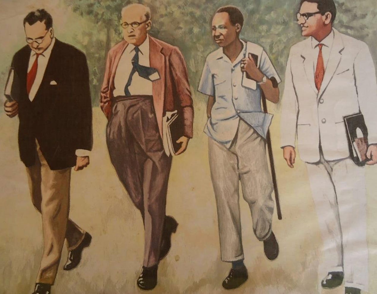 A painting of President Nyerere and his advocates during his case in 1957 (Courtesy of the Mwalimu Nyerere Foundation Dar es Salaam, September 2015)