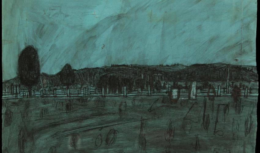 James Castle, Farmscape, n.d. Soot on blue-tinted found paper. William Louis-Dreyfus Foundation. Source: SBMA