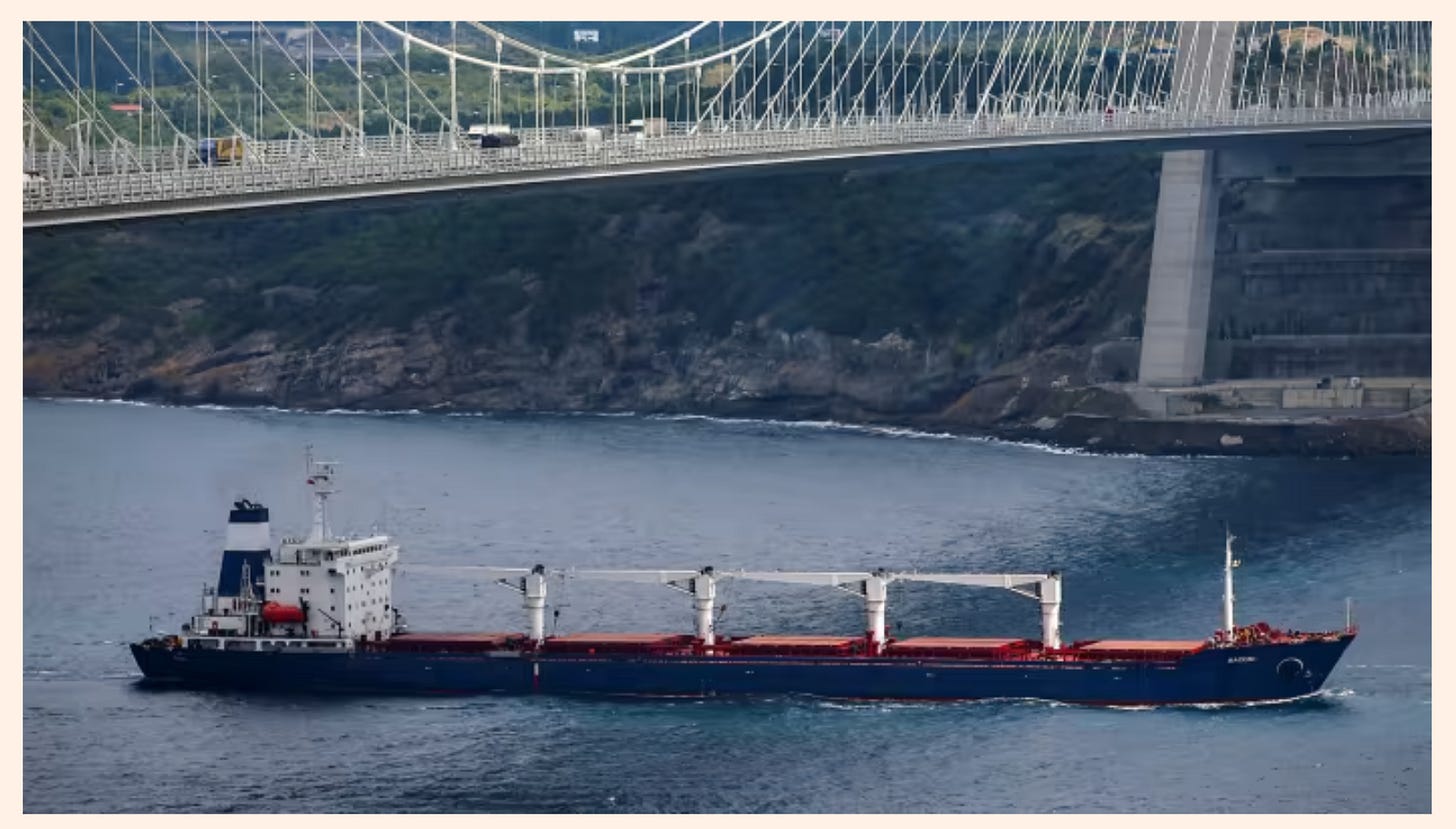 The Lebanon-bound Razoni, which had been stuck in Odesa since Russia started its invasion of Ukraine, enters the Bosphorus strait in Istanbul on Wednesday