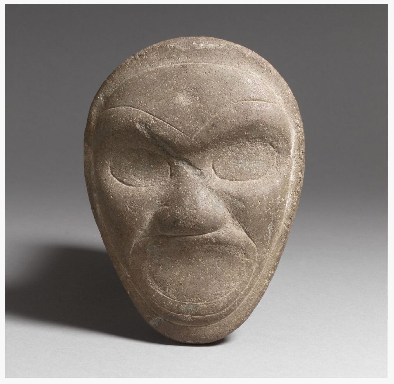 This work from Puerto Rico may be what is known as a guaíza, a category of objects in stone, wood, or shell that feature rounded heads and zemí faces. Zemí (or cemí) is a term used by Taíno peoples, the diverse societies that inhabited the Antilles archipelago before European contact, that linguistically relates to a quality akin to sweetness. Zemí refers not to an object or image but to an immaterial, spiritual, and vital force pertaining to deities and ancestors. There are several known zemí identities recorded by the Spanish, some of which have been linked to archaeological images.