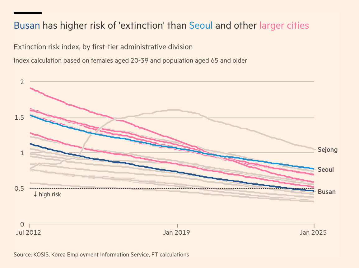 For most of the 20th century, Busan was a thriving hub of trade and industry. But the city is now in the throes of an exodus of the young that has left it ageing faster than any other metropolitan area in a country that already has the lowest fertility rate in the world. Located on the south-east tip of the Korean peninsula just across from Japan, Busan’s fortunes have worsened since the 1990s as local industries suffer from South Korea’s transition into a high-tech industrial economy. The Korea Employment Information Service, a government agency, last year officially classified Busan as “at risk of extinction” — when the imbalance between the working and non-working populations makes a city economically unsustainable. The city of 3.3mn shed 600,000 people between 1995 and 2023. Demographers warn this trend is accelerating as the city’s population ages and Seoul tightens its grip over the country’s economy. Busan retains both charms and assets — mountains and beaches, temples and nightlife, famous film and art festivals and proximity both to Japan and to industrial centres clustered along South Korea’s east coast. While it was the birthplace of leading conglomerates Samsung and LG, not one of South Korea’s 100 largest companies is headquartered in the city. “The outflow of young people is getting larger,” said Seo. “Every time I go back, I can see it losing its vitality.” Busan boomed in the second half of the 19th century because of its proximity to Japan — a bridgehead first for Japanese trade and investment and later for colonisation.