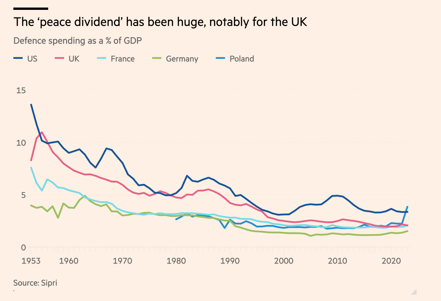 It is common to complain about German defense cuts, but it was the UK that saw the largest swing away from Cold War era defense spending in the 1990s.