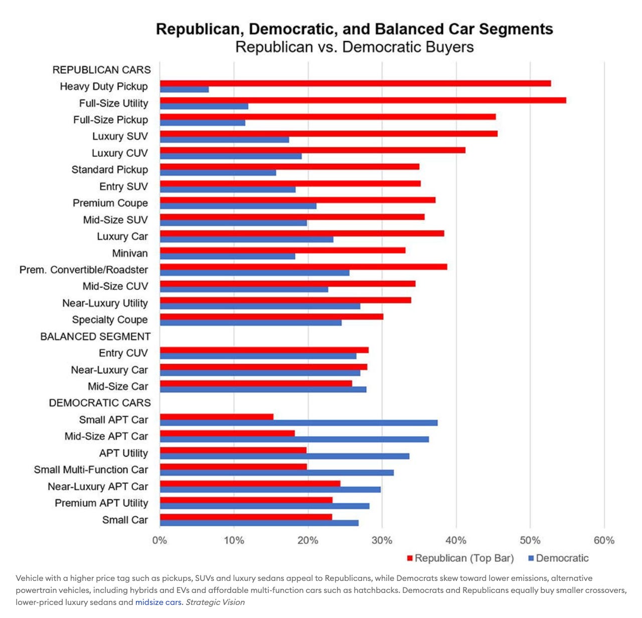 Republicans make up 55% of the full-size utility (SUV) market and 53% of the heavy duty pickup market (table below); Democrats make up 38% and 36% of the small and mid-size APT (hybrids, EVs) market, respectively. The single greatest Republican-Democrat disparity is the heavy duty pickup truck segment, where Republicans buy eight pickups to one for each Democratic buyer.