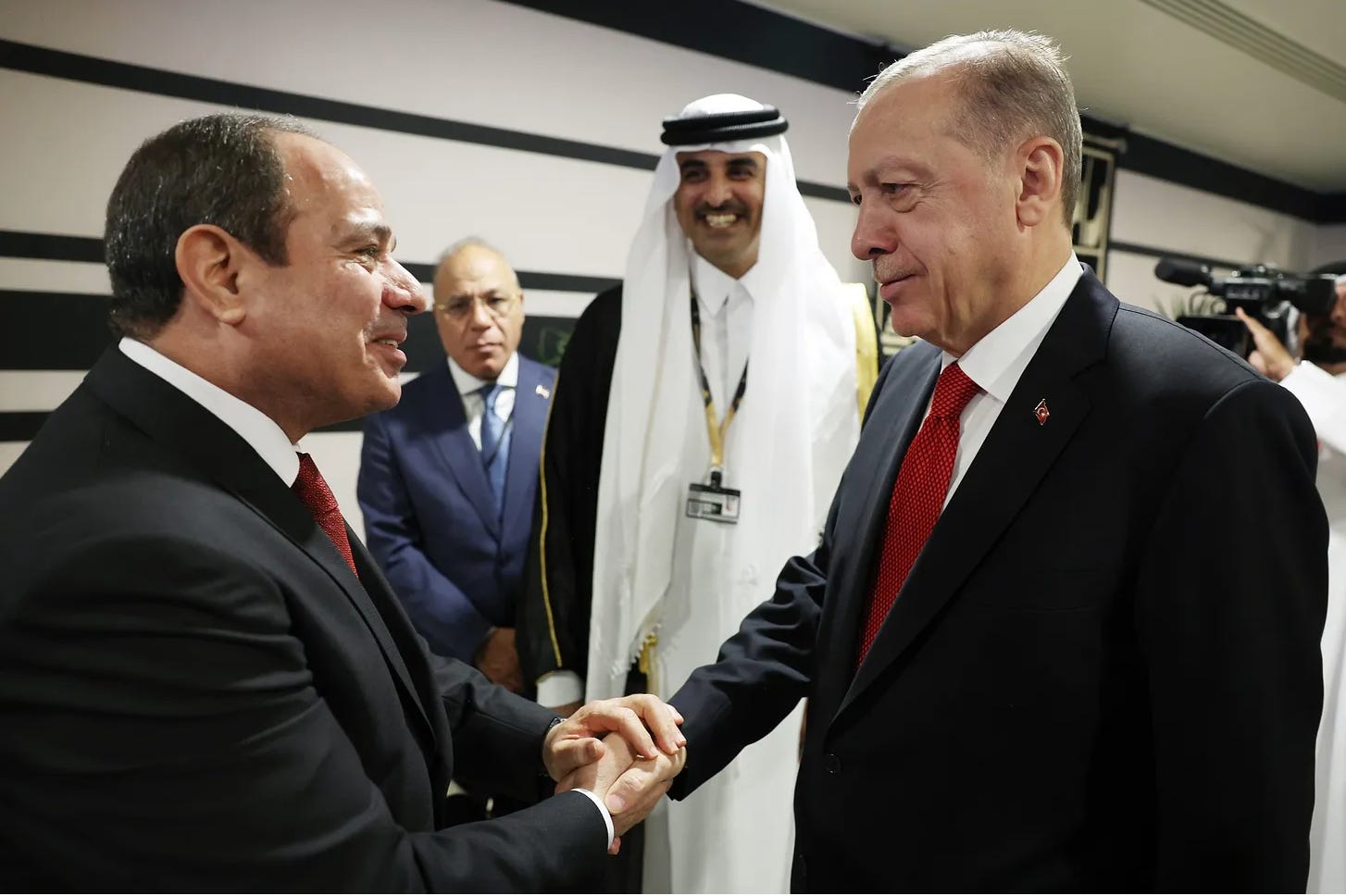 Erdogan who has repeatedly referred to Sisi as a murderer and a putschist… Sisi who has repeatedly accused Erdogan of attempting to destabilise his country by supporting a terrorist organization that is the Muslim Brotherhood (MB). They shook hands. Erdogan now claims that he intends to meet with al-Sisi as soon as the foreign ministers reach agreement on specific issues
