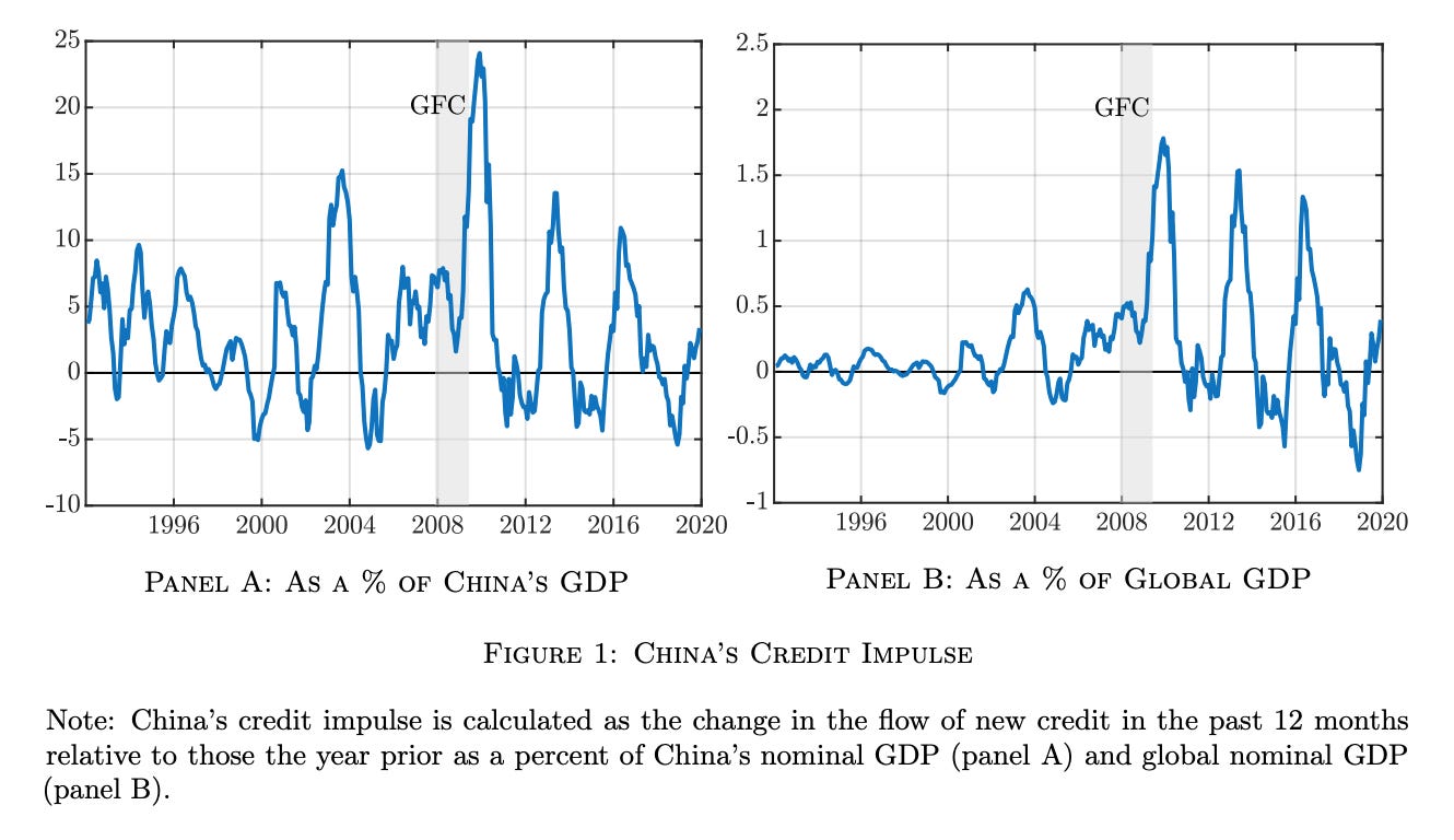 “… prior to the GFC, China’s credit measures represented a small share of global GDP. However, with China’s rise in the global economy, the quantitative importance of China’s credit policies has risen as well. Indeed, China’s last three stimulus episodes each accounted for around 1.5% of global GDP. … Altogether, if we compare the results from our benchmark model to the literature that focuses on the role of U.S. monetary policy as an important driver of the global financial cycle, it appears that the channels of financial spillovers from China’s credit policies are different from those stemming from the United States. As documented in Miranda-Agrippino and Rey (2020) financial spillovers from U.S. monetary policy transmit through mainly through global financial actors given that the 25 United States is highly interconnected in the global financial system. Expansionary U.S. monetary policy shocks are followed by a significant increase in leveraging of global financial intermediaries, a decline in aggregate risk aversion, an expansion in global asset prices and global credit, a narrowing of corporate bond spreads, and a rise in gross capital flows. In contrast to the United States, China does not have a big presence in global financial markets. Yet, our results suggest that spillovers from China reverberate through the global financial system predominantly through sentiment effects. Expansionary credit policies in China lead to an increase in Chinese consumption, which raises global growth. Higher global growth prospects lead to an increase in global risk sentiment and an expansion in global asset prices and global credit.”