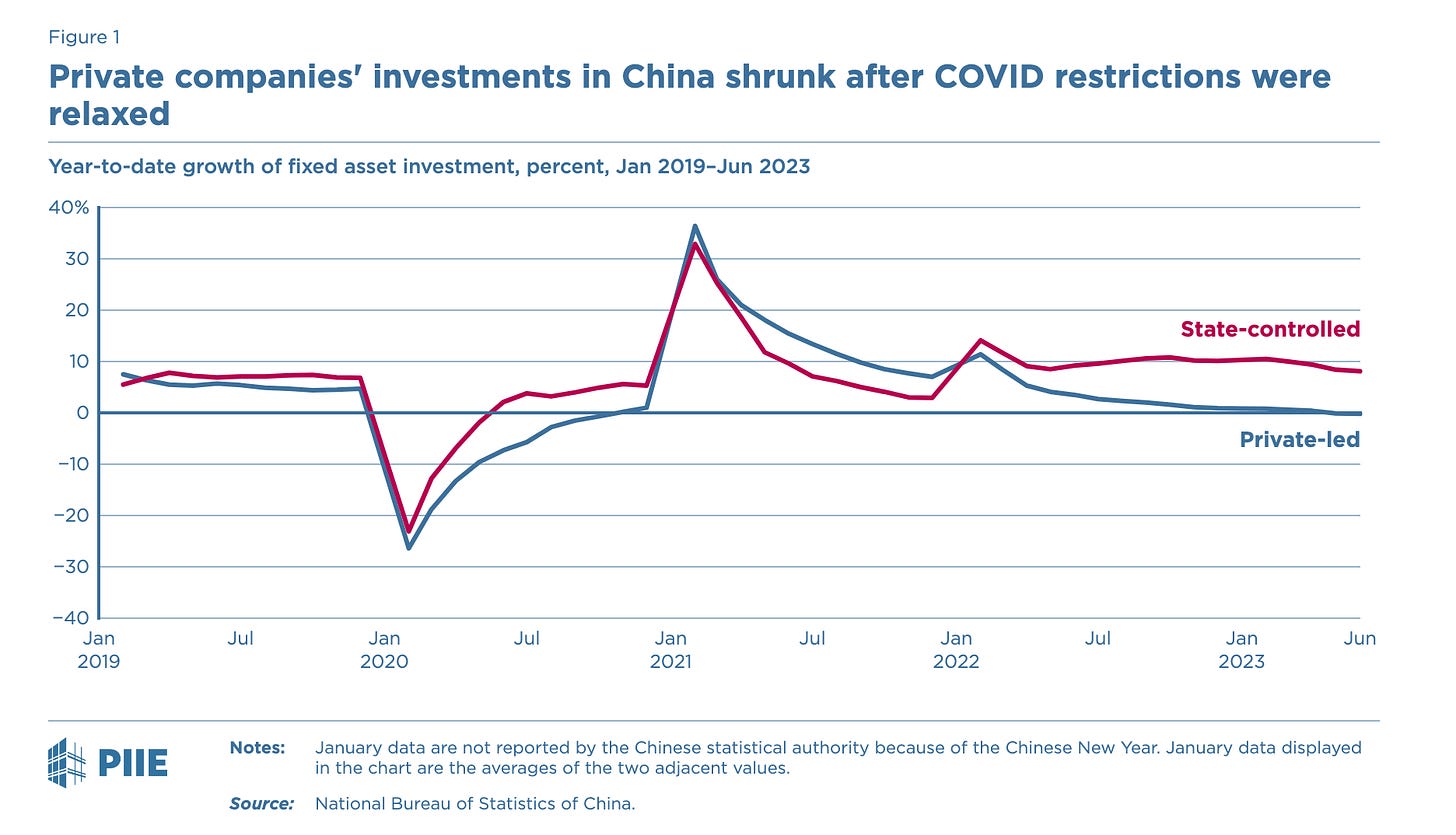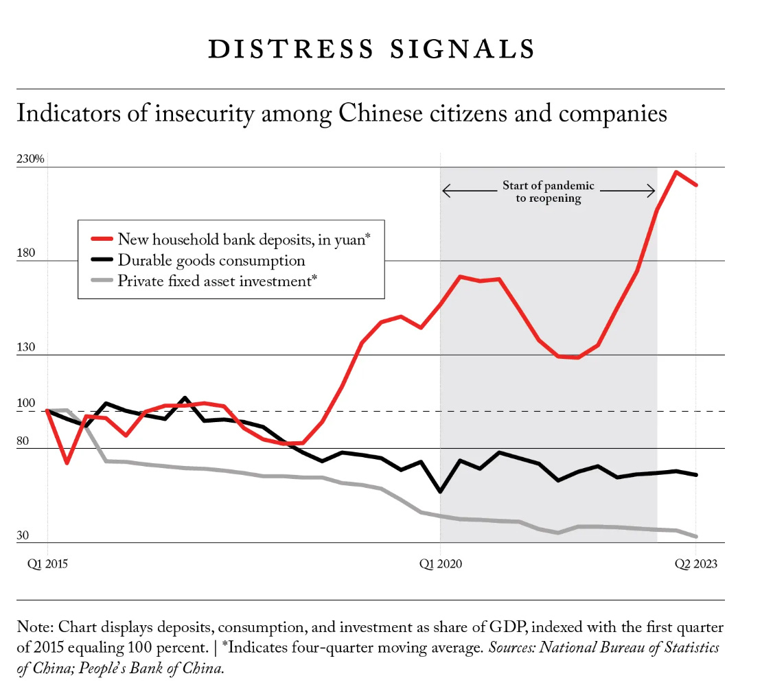 My bet is that Posen steers clear of discussing the housing crisis - overwhelmingly the most important source of uncertainty in the Chinese economy right now - because it causes problems of his argument. He knows that it does not fit his overarching thesis that the regime’s authoritarianism is the main source of risk for the modern Chinese middle class and that this by itself makes Xi’s regime incapable of ensuring sustained economic growth. At a technical level, as Michael Pettis explains, the figures for bank deposits that Posen cites to underpin his case, reflect both an increased rate of savings by worried households and a reallocation away from riskier assets, more closely associated with risks in housing. They are, in other words, an indicator of specific as much as general uncertainty. This is not to deny that the repressive tendencies and the ideological intent of the regime are a source of risk for private business and private individuals. Of course, they are. But the regime also offers advantages and protections. And those are not merely cold comforts. One cannot sensibly generalize about a downward spiral into an increasingly abusive relationship, as Posen’s narrative suggests. Sectoral performance is not a detail. It is all important. What is decisive is whether Beijing gets policy right and this reflects specific issues of policy and political economy that go beyond the simple boundary between public and private. These more complex balances of interests were decisive in the handling of COVID, of the real estate crisis, of the debt crisis, in the economic war with the US. They will be the topic of further installments to come.